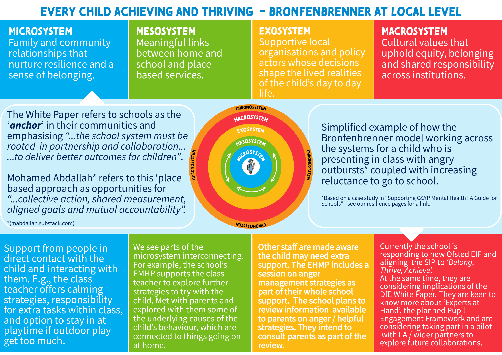 Bronfenbrenner reminds us that children’s development is shaped by the relationships and systems around them. Schools are a vital part of this ecology, but children thrive best when families, schools, communities and services work together to create environments of safety, belonging and opportunity.