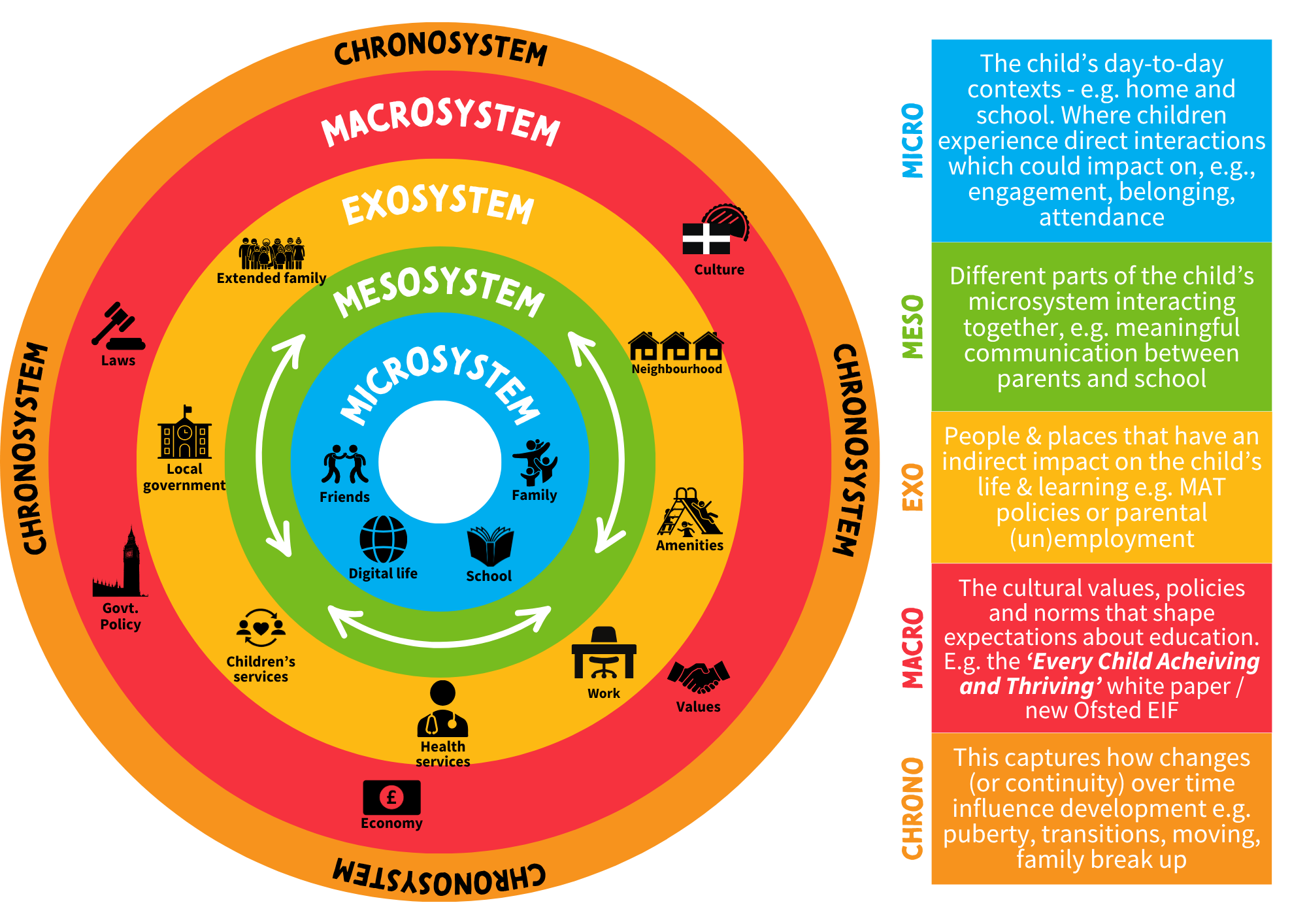 NB The original model did not include the digital, online world as an influencing factor for individuals in the microsystem. The role of social media and online life is huge for most of our children and it is a powerful factor that YP themselves want to be considered.