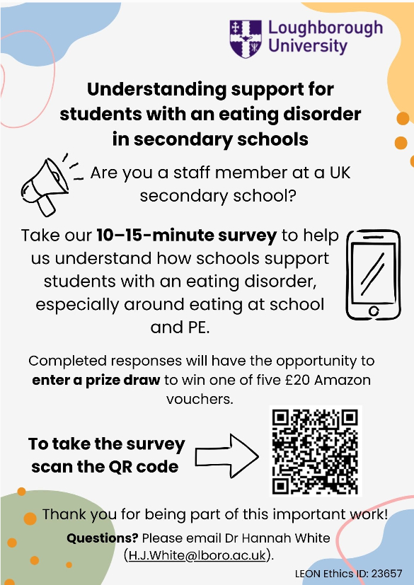 Loughborough University is inviting secondary school staff to take part in a short survey exploring how students with eating disorders are supported, particularly around eating in school and PE. Completed responses can enter a prize draw for one of five £20 Amazon vouchers.